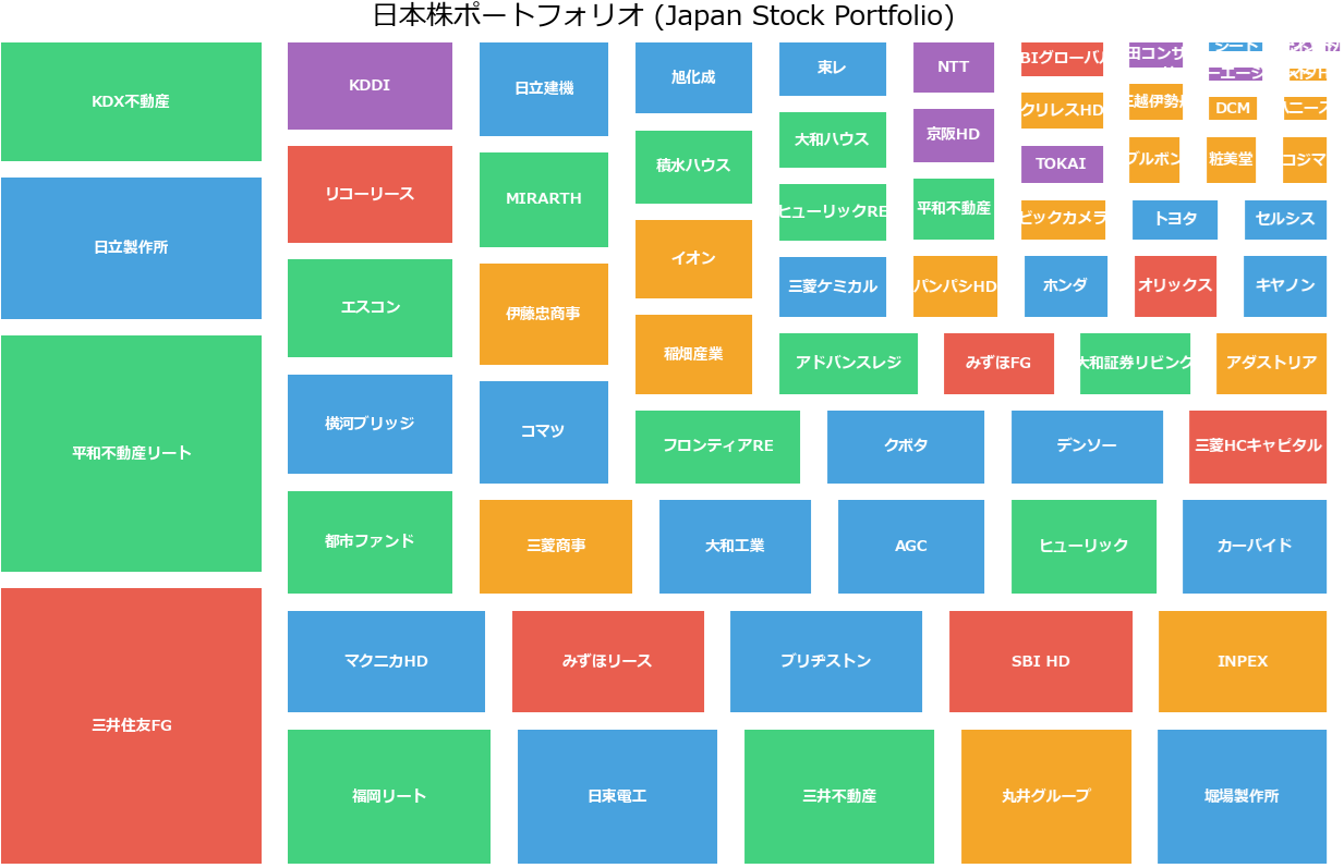 43juni自体のサービス終了に伴い、PF詳細画像なしが2年程度続きましたが、今回試したNotebookLMにてポートフォリオ一覧を出力できたため、全体ポートフォリオ状況と日本株ポートフォリオを添付しておきます。(日本株ポートフォリオの色分けは、【赤】金融・リース、【緑】不動産・REIT・建設、【青】製造・化学・素材・機械、【橙】商社・小売・卸売、【紫】通信・サービス・その他、です)